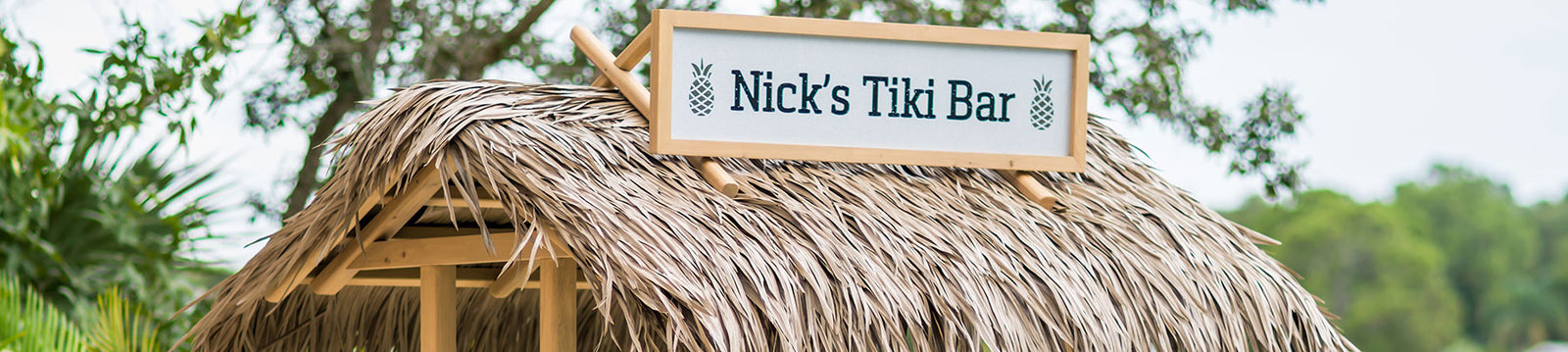 Our custom signs are designed to fit in a wood frame that sits on top of the tiki bar’s thatched roof. The crossed pattern base of the frame gives the bar a more custom look and blends beautifully with the tropical theme of the bar.